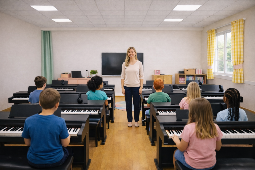 Our piano group lessons are designed for students from kids to adults, with classes thoughtfully organized by age and playing level. Students benefit from teacher guidance while learning alongside peers in a motivating and interactive environment.